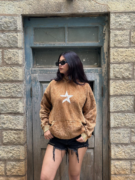 Down Shoulder Marble Washed Hoodies With Puff Print